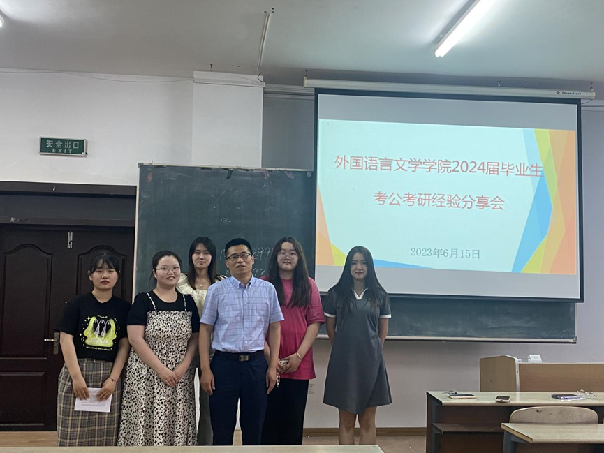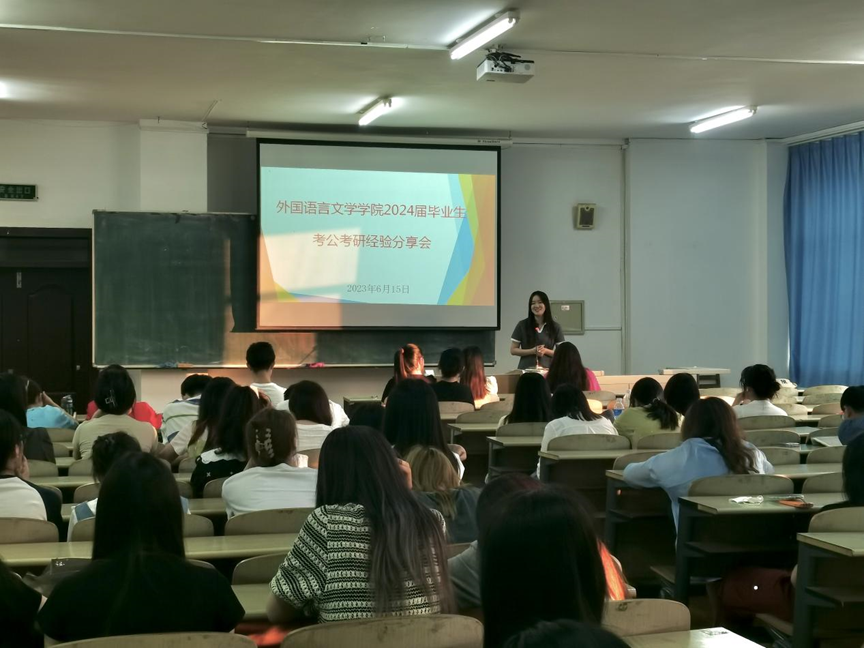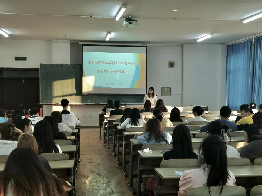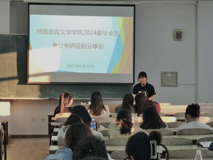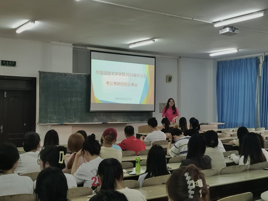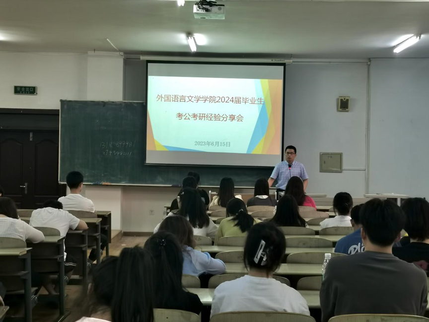 为进一步促进学院就业工作发展,加强员工就业的精准指导,更好地帮助员工了解考公考研形势,2023年6月15日18时,外国语言文学学院在东区1号教学楼B217教室举行2024届毕业生考公考研经验分享会。会议由辅导员李魁老师主持,邀请5位2023届考公考研成功上岸的优秀毕业生主讲,2024届英日俄韩各专业毕业生150余人参加。